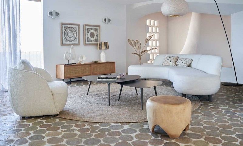 Beistelltische, Sessel und Hängesessel sind ideal, um diesen kühnen Stil in Ihrem Zuhause hervorzuheben. Wenn Sie außerdem geschwungene Dekorationsstücke wie Krüge in den Ecken des Raums platzieren, wird die Linearität Ihrer Wand, Decke und Ihres Bodens durchbrochen.